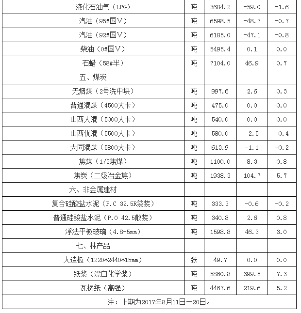 流通領域重要生產資料市場價格變動情況(2017年8月21日—30日)